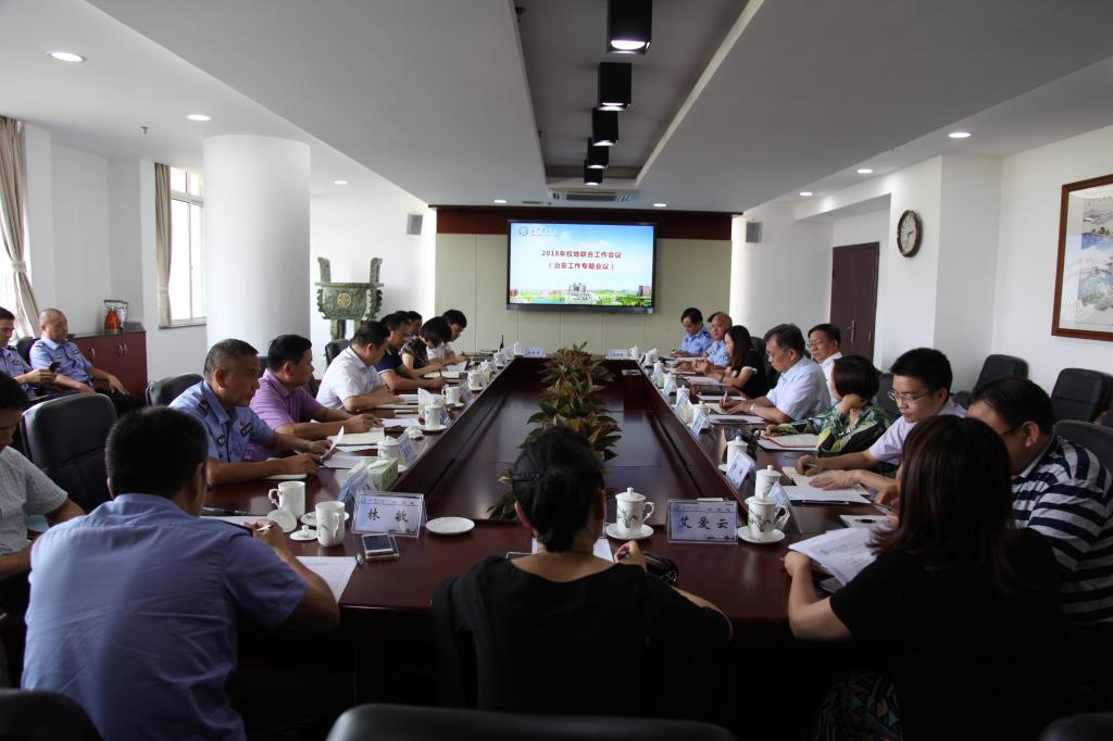 为进一步加强校地合作,共同创建平安校园,9月20日下午,校地联合办公室在一办四会议室召开校地联合工作会议,专题研究我校的治安工作,探讨治安安全的防范管理措施,切实降低发案率,天心区委政法委书记黄文先携校地联合办公室成员单位有关政府部门负责人一行参加会议,校党委书记付宏渊、副校长谈传生出席了会议,校党委委员付嫦娥主持会议。