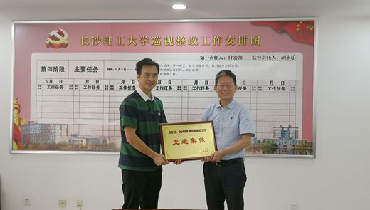 我校保卫处被湖南省公安厅评选为2018-2019年度省级治安保卫重点单位保卫工作先进集体,保卫处张祎、林杰、李桔洲、易国安被评选为2018-2019年度省级治安保卫重点单位保卫工作先进个人,公安厅国保总队副总队长张云峰和副校长叶泽为我处发放奖牌。