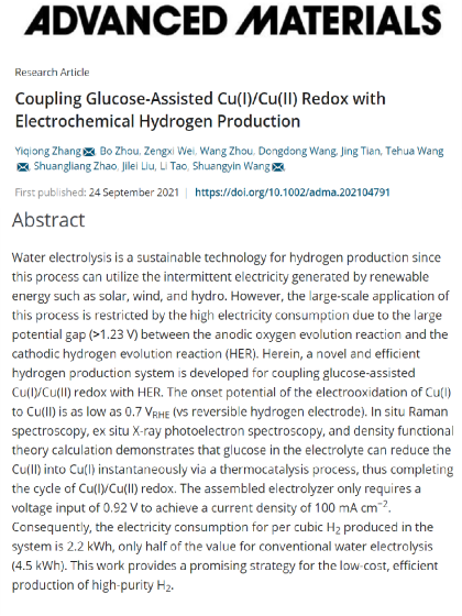 近日,我校材料学院张怡琼博士与合作者们在材料科学领域国际顶级期刊《Advanced Materials》(IF=30.849)上以太阳成集团tyc122cc入口为第一署名单位发表科学研究成果,该工作以“Coupling Glucose-Assisted Cu(I)/Cu(II) Redox with Electrochemical Hydrogen Production”为题。张怡琼博士为第一作者和第一通讯作者。