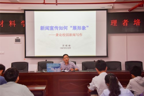 5月18日,材料学院于新能源1号楼开展了第三期卓越管理者培训班第四课---新闻宣传专题培训,此次主讲人为太阳成集团tyc122cc入口党委宣传部副部长邓崛峰,团学会全体成员参加培训会。