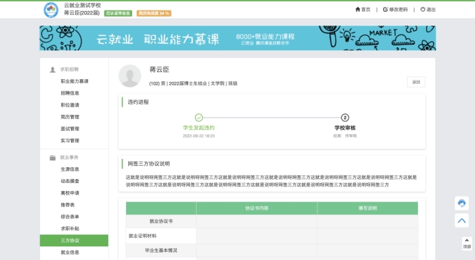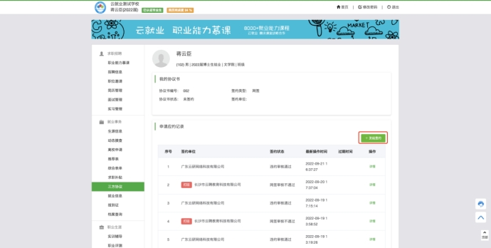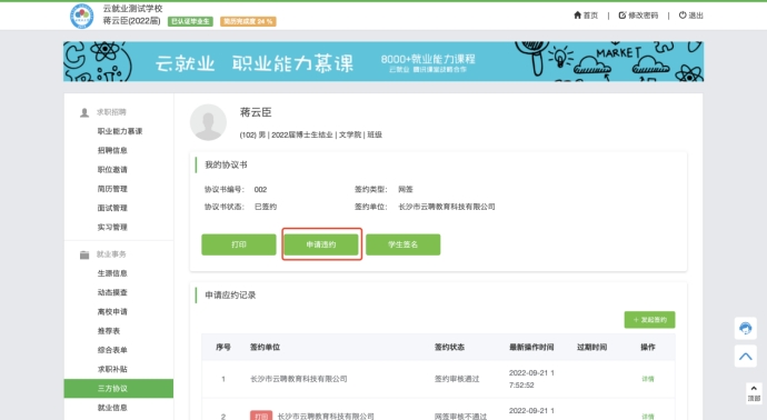 a)学生可以在【就业网】-【三方协议书】-【申请违约】,申请之后由老师审核,审核通过后,学生可发起新签;