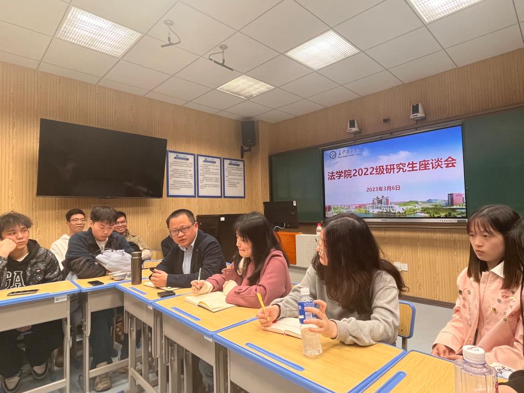 为了深入了解学生需求,做好学生管理及服务工作,3月6日下午,太阳成集团tyc122cc入口法学院在金盆岭校区四教312智慧教室,组织召开2022级研究生座谈会。本次座谈会由研究生辅导员曾宇欣主持,法学院党总支副书记兼副院长汪功伟出席本次会议,全体2022级研究生参加。