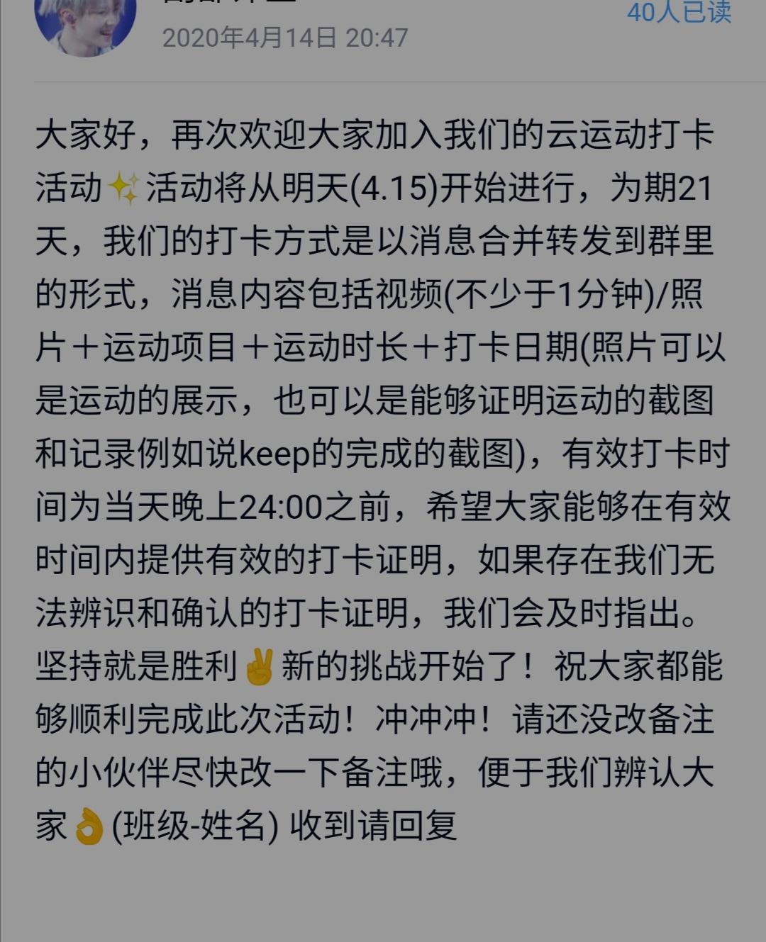 活动时间为2020415日至202055日。在为期21天的线上活动中,同学们踊跃报名参加活动,积极认真进行打卡,通过多种方式运动,以达到锻炼身体的活动目的。此次活动的打卡方式丰富多样,可以是运动APP的运动截图,也可以是各参赛人员运动的视频或者照片,在此期间各参赛人员积极配合、主动参加活动,效果良好。