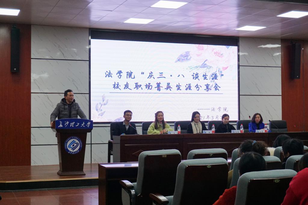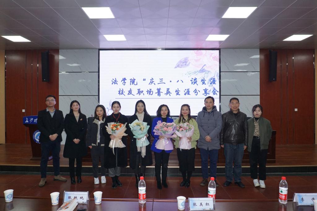为庆祝第111个“三八”国际妇女节,法学院于3月7日在金盆岭校区四教报告厅举办“庆三·八 谈生涯”校友职场菁英生涯分享会,邀请了来自法院、检察院、律师事务所以及企业的法学院优秀女性校友为同学们分享职业心得。校友中心主任李伟、法学院党总支书记田兴洪教授、法学院副院长(主持工作)张敏纯副教授、辅导员代表以及法学院全体研究生、2020级本科生以及城南学院法学专业本科生参加活动。分享会由法学院辅导员刘阳主持。