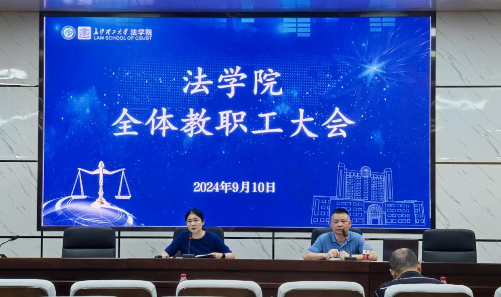 9月10日下午,法学院在金盆岭校区四号教学楼1楼学术报告厅召开新学期第一次全体教职工大会,会议由党委书记龚文斌主持,全院教职工参加会议。