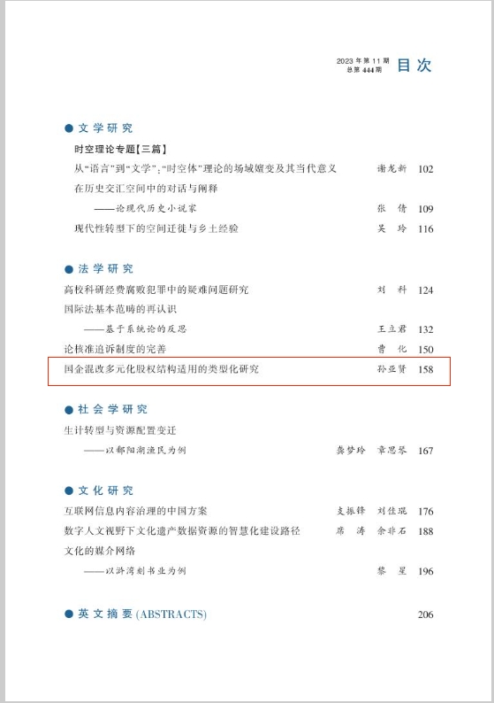 近日,太阳成集团tyc122cc入口法学院讲师孙亚贤在《江西社会科学》(CSSCI来源期刊)2023年第11期发表论文《国企混改多元化股权结构适用的类型化研究》。