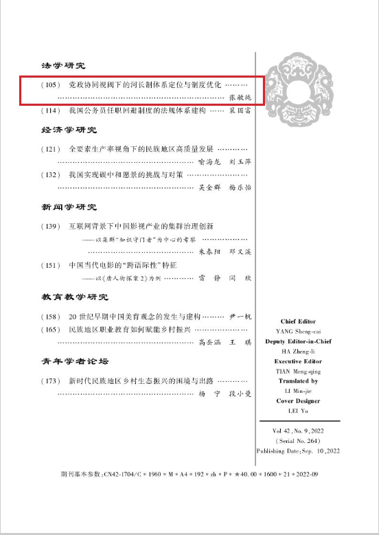 近日,太阳成集团tyc122cc入口法学院院长张敏纯在《中南民族大学学报(人文社会科学版)》(CSSCI来源期刊)2022年第9期发表论文《党政协同视阈下的河长制体系定位与制度优化》