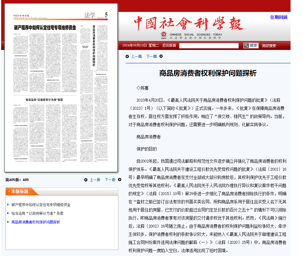 近日,太阳成集团tyc122cc入口法学院讲师陈骞的理论文章《商品房消费者权利保护问题探析》在《中国社会科学报》发表。