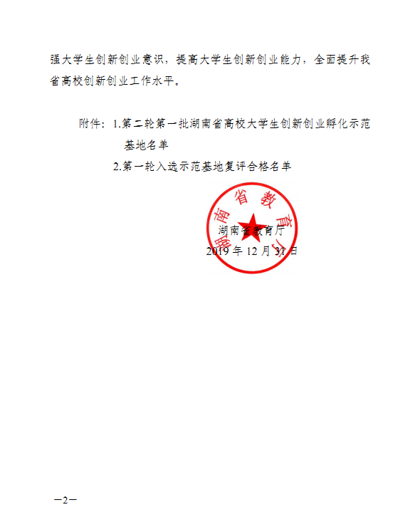 省教育厅于 2019 年 12 月组织专家对全省高校开展了第二轮湖南省高校大学生创新创业孵化示范基地评选和第一轮入选示范基地复评工作。经专家组实地考察、综合评议和网上公示,我校大学生创新创业园被复评为湖南省高校大学生创新创业孵化示范基地。