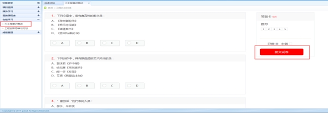操作如下图:在左侧菜单栏点击“在线学习”选择其中一个在线项目,弹出相关学习资料,学习完成后会显示本项目在线学习试题,做完试题提交后,系统自动阅卷并产生本项目在线考试成绩。