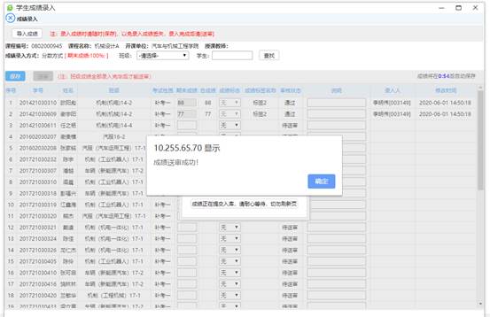 步骤6.   设置完成后进行学生成绩录入,系统自动根据成绩项目所占的比例计算出总成绩,当同一个标签的所有学生成绩录入完成后,点击【送审】按钮进行成绩录入提交即可完成成绩分批录入。