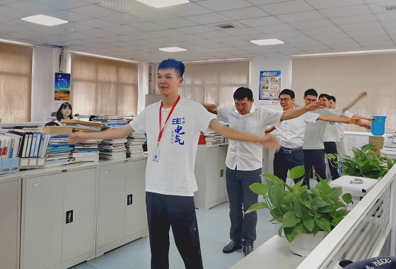 每日上午十点半,株洲中车机电科技有限公司的办公楼六楼事业部办公室内就会响起充满活力的音乐。技术部职工和实践队员随着音乐做起广播体操。“大家都动起来!把胳膊腿都伸展开”,综合主任专员张君负责每日广播操的领操工作。工间操活动有效缓解了工作疲劳,增强了公司职工与实践队员的体魄,展现了中车集团特有的企业文化。工业自动化事业部的易剑晖设计工程师表示:“自从有了举办工间操活动,我感觉更有青春活力了,就像眼前这些年轻人一样。”