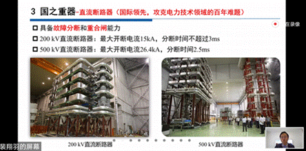 裴翔羽老师进一步对特高压直流输电领域的“国之重器”进行图片展示和技术介绍。通过中外对比,为同学们展示了世界领先水平的特高压关键技术,详细解读了中国特高压直流输电工程中的换流阀、直流断路器、柔性直流输电控制保护设备、直流电网快速行波保护装置以及直流电网实时数字仿真平台等关键装备和技术,让同学们感受了中国创造的硬核实力。
