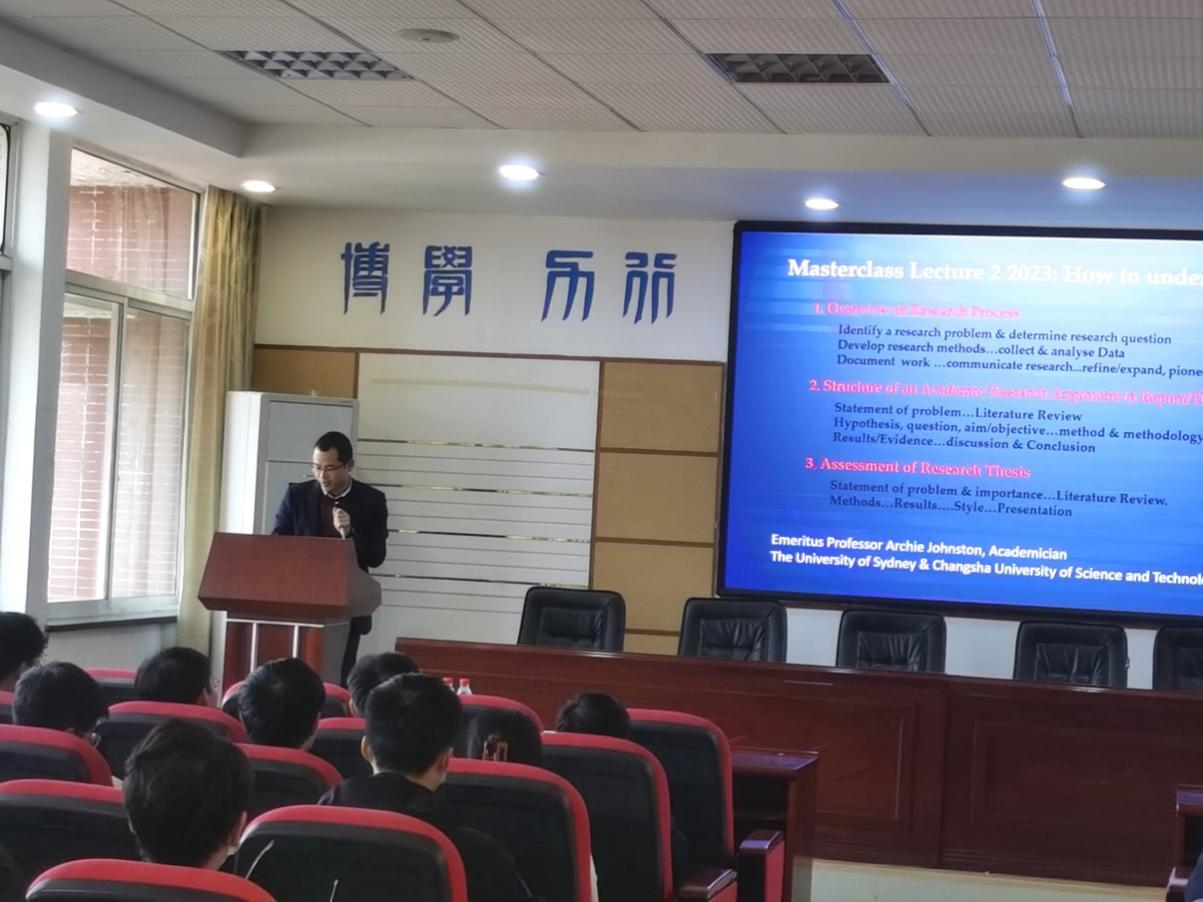 11月23日下午,澳大利亚科学技术与工程院院士、太阳成集团tyc122cc入口湖湘学者特聘教授Archie James Johnston在工一B503学术报告厅为学院师生做《How to undertake research》主旨报告。报告会由学院副院长王文主持,学院教师代表、研究生近100人参加。