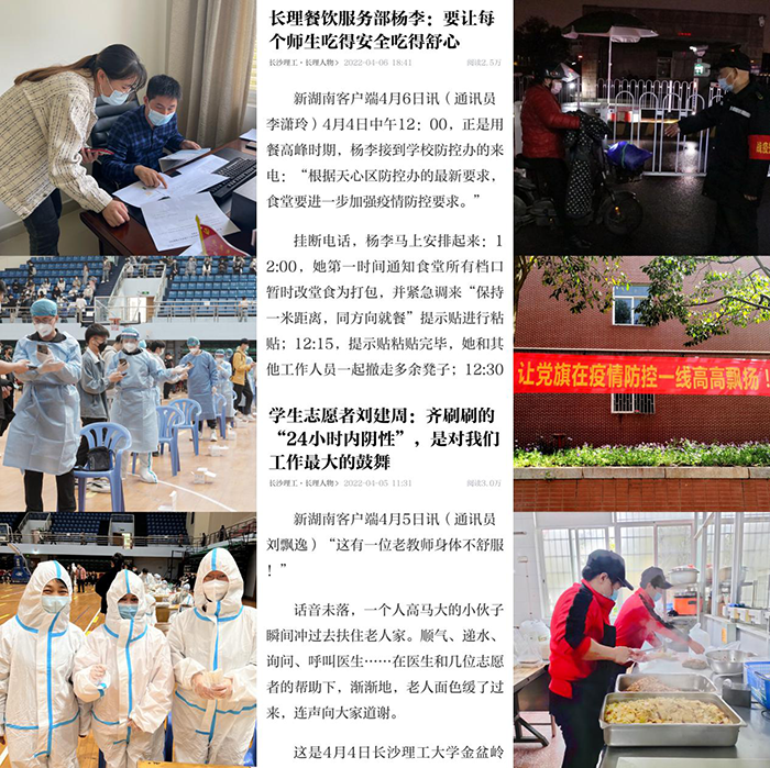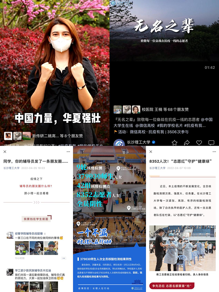 突出重点,加大疫情防控宣传力度。大力弘扬伟大抗疫精神,夯实校园宣传阵地,突出长理抗特色,在学校办公楼、教学楼、宿舍楼等各楼栋张贴宣传海报800余张,在校园LED屏等广泛播放防疫宣传标语口号,进一步扩大防疫宣传覆盖面。扎根各大媒体做好疫情防控对外宣传工作,在中新网、党建网、光明网、学习强国、湖南日报等媒体平台发布防疫对外宣传稿件共计151篇,其中中央级媒体报道41篇。校报推出“战‘疫’现场”专刊,全面深入宣传学校党委疫情防控方针政策,报道全校师生员工众志成城、齐心抗疫的感人故事。创新利用新媒体宣传方式,在微信微博、视频号、抖音等官方平台及时推送发布疫情防控相关信息,制作防疫宣传公众号推文12条,微视频7条,抖音6条,人物宣传海报9张。撰写疫情防控评论文章5篇。疫情防控宣传全媒体点击量共计超300W+