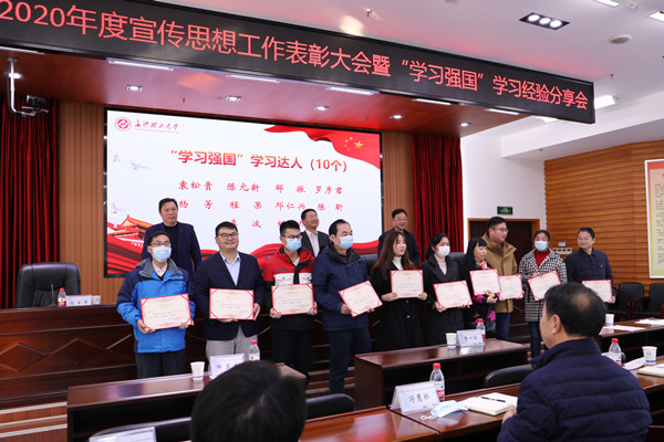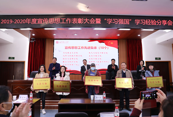 12月30日,我校在云塘校区一办九楼会议室举行宣传思想工作表彰大会暨“学习强国”学习经验分享会。校党委副书记、校长曹一家,校党委副书记邹宏如,校党委委员、组织部部长齐路良,学校各二级党组织主要负责人,各机关单位负责人,师生代表参加会议。会议由校党委委员、宣传部部长方琼主持。