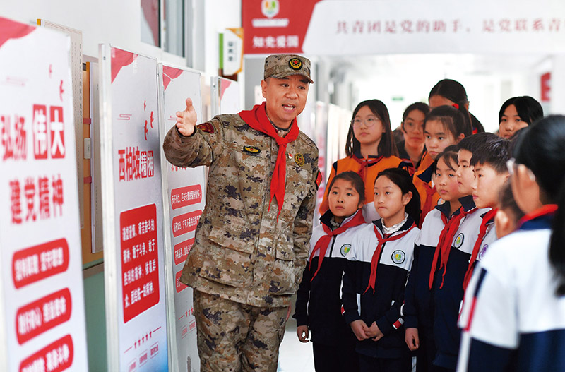 树高千丈必有根,江流万里总有源。读懂中国共产党,必须读懂中国共产党的精神;读懂中国共产党的精神,必须读懂中国共产党的精神之源。图为2024年3月18日,在山东省青岛市市北区延安二路小学举行“国防教育进校园”主题活动上,宣讲员为学生们讲述伟大建党精神。 中新社发 王海滨/摄