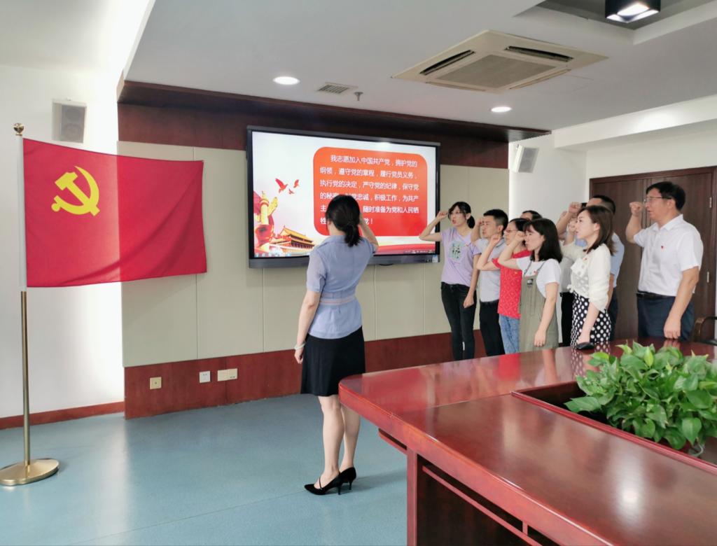 党支部书记周艳红开篇致辞,回顾奋斗历史,我党战胜了种种困难,来到"两个一百年"奋斗目标交汇点,作为9191.4万党员中的一员,我们要坚决服从以习近平同志为核心的党中央统一领导,以更饱满的热情发挥共产党员的先锋模范精神,永葆共产党员的政治本色。随后,在周艳红带领下,党支部全体党员重温入党誓词,仪式上,全体党员右拳高擎,神情庄重,面对鲜红的党旗郑重宣誓。铿锵的誓言徘徊在会议室中,深埋在每一位党员的心中。