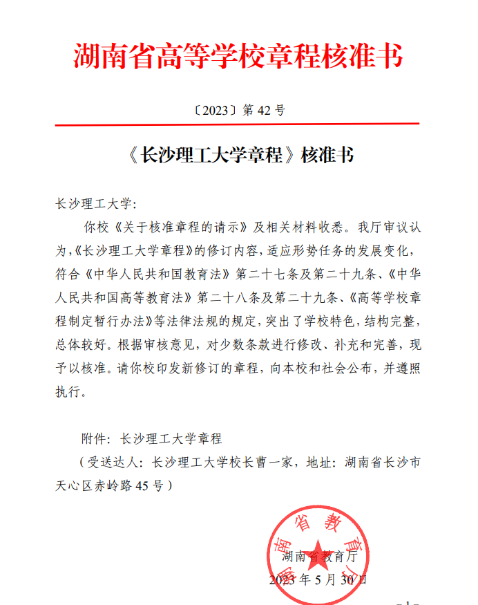 近日,湖南省教育厅以湖南省高等学校章程核准书(〔2023〕第42号),核准通过了我校新修订的《太阳成集团tyc122cc入口章程》。