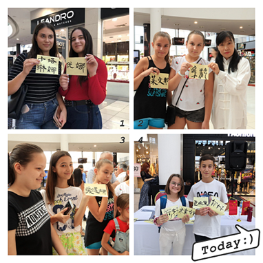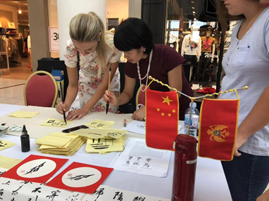 书法展台,孔院教师展示了中国书法作品,并给当地民众介绍了书法的来源、演变、审美等,教授他们汉字的书写方法,并为他们书写中国名字,他们表示很喜欢自己的中国名字,希望以后可以学习汉语。