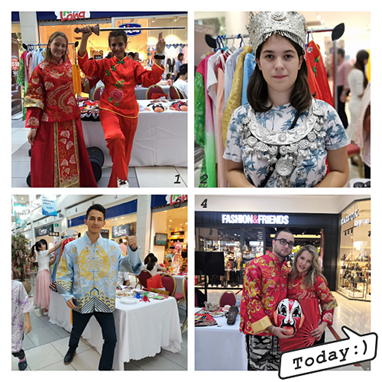 在服饰展台,孔院教师向当地民众介绍了中国不同朝代的服饰及其发展和寓意,他们非常开心地试穿了不同风格的服饰,表示中国服装很漂亮,体现了一种祥和柔美。