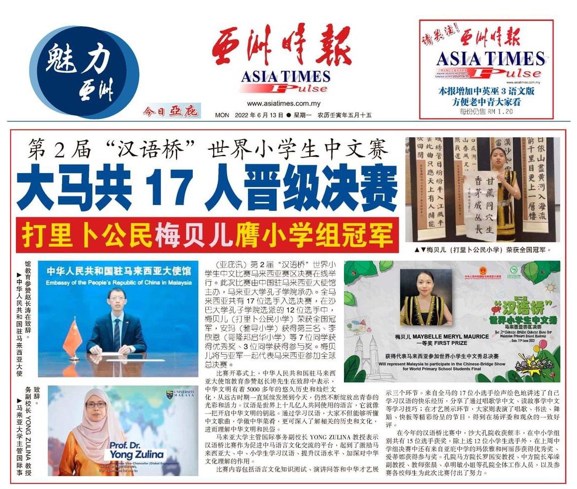 6月11日,来自沙大孔院的小选手梅贝儿夺得第2届“汉语桥”小学生中文比赛马来西亚赛区冠军,《亚洲时报》《星洲日报》等多家媒体对此进行了报道。本年度“汉语桥”比赛沙大孔院收获颇丰,在中小学组别共有15位选手获奖,引起广泛社会关注。连日来多所学校与机构前来孔院接洽文化活动合作事项。