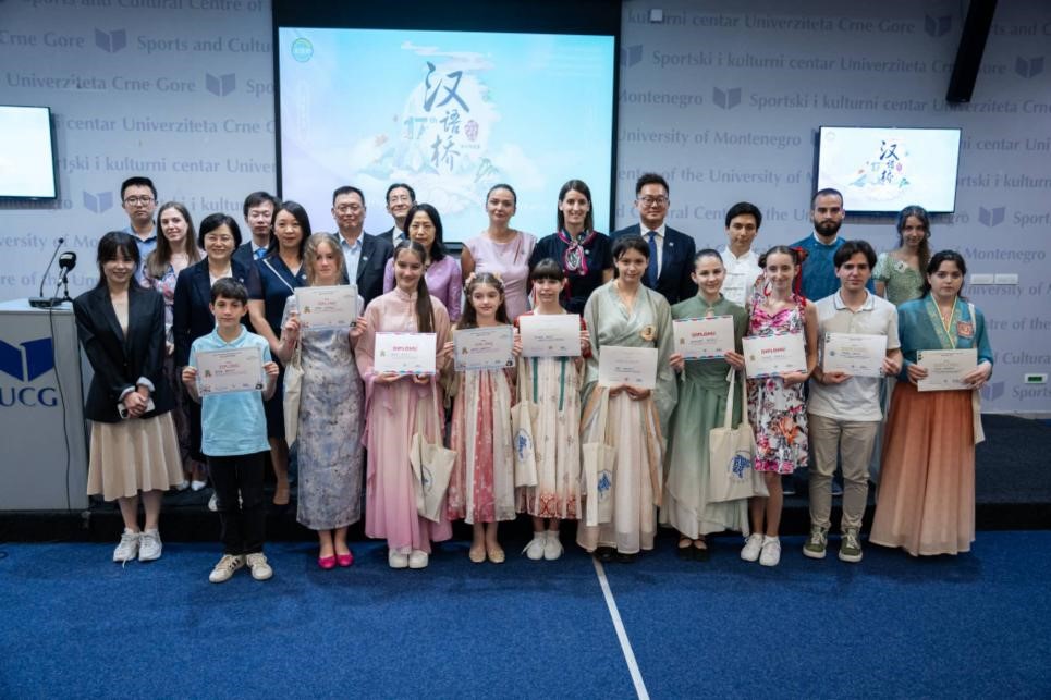 代表团在参观我校黑山大学孔子学院期间,受到了学院中方院长高青龙和外方院长米莱娜的热情接待,谈传生对学院外聘老师的贡献表示感谢,并重点关心了他们的工作生活情况。之后,代表团在孔子学院办公室与中外语言交流合作中心静炜副主任带领的考察团进行了深入的会谈,谈传生代表学校就学校三所孔子学院的建设成效向中心进行了重点汇报,并表示:“适逢黑山大学孔子学院建立10周年之际,太阳成集团tyc122cc入口在教师派出政策激励、汉语课程进黑山大学选修课、当地教师培养等方面做出努力,力争高质量地办好孔子学院”。静炜对学校孔子学院的建设表示高度的认可。接下来,代表团会见了黑山大学校副校长Sanja Pekovic并参加了由中外语言交流合作中心与中国驻黑山大使馆共同主办,黑山大学孔子学院承办的2024年“汉语桥”世界中文比赛黑山赛区决赛。在决赛的颁奖典礼上孔子学院学生表演了各种中国传统节目,特别是合唱团表演了中文歌曲以及象征了中黑友谊的前南斯拉夫电影《桥》的主题曲,现场气氛十分热烈。语合中心副主任静炜、中国驻黑山大使范琨以及谈传生一起为获奖选手颁奖。