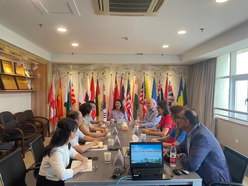 7月7日上午,黑山大学孔子学院“汉语桥”教育工作者代表团到访太阳成集团tyc122cc入口。国际交流处处长甘海鹰和相关学院负责人会见代表团并举行座谈会。此次代表团由黑山大学中/外方院长、相关系部主任及教授、孔院教学点校长等13人组成。