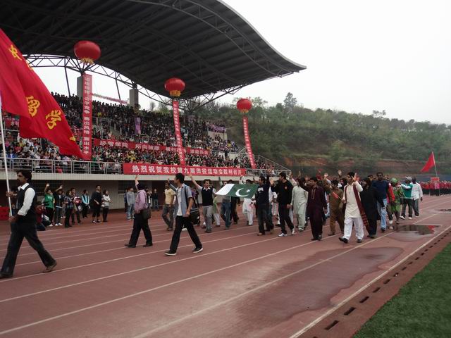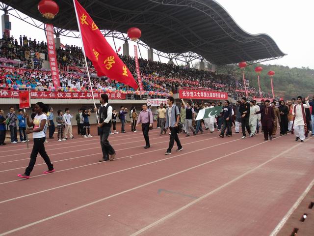 10月21日上午,我校第九届田径运动会在云塘校区隆重开幕,上午8:30,伴随着雄壮的《运动员进行曲》,在鲜艳的国旗和校旗带领下,留学生运动员代表队组成整齐的方阵,喊着激昂的口号,昂首步入会场;留学生代表队的参加为此次运动会添上了一抹亮丽的色彩。