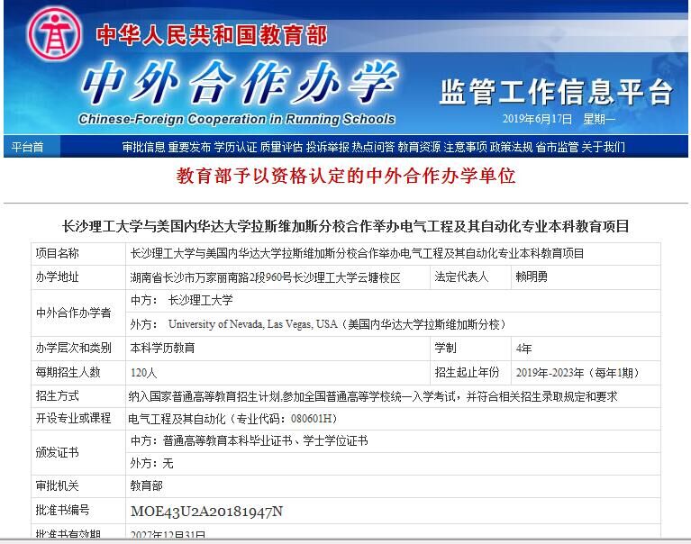 太阳成集团tyc122cc入口与美国内华达大学拉斯维加斯分校合作举办电气工程及其自动化专业本科教育项目于2018年获得教育部批准(编号:MOE43U2A20181947N),融合两校强势专业“电气工程”之优势,严格遵守《中外合作办学条例》和《中外合作办学条例实施办法》办学,紧密依托国际化、专业化的高水平管理团队运行。该项目融合中美双方优质教育资源,精心打造人才培养方案,其中1/3以上核心课程采用美方原版教材、师资、教学方式等优质教育资源,培养兼具国际化视野与家国情怀、拥有创新精神和跨文化交际能力、系统掌握电气工程专业基础理论知识和现代工程技术、具备良好科学素养与工程实践能力的应用型高级专门人才。