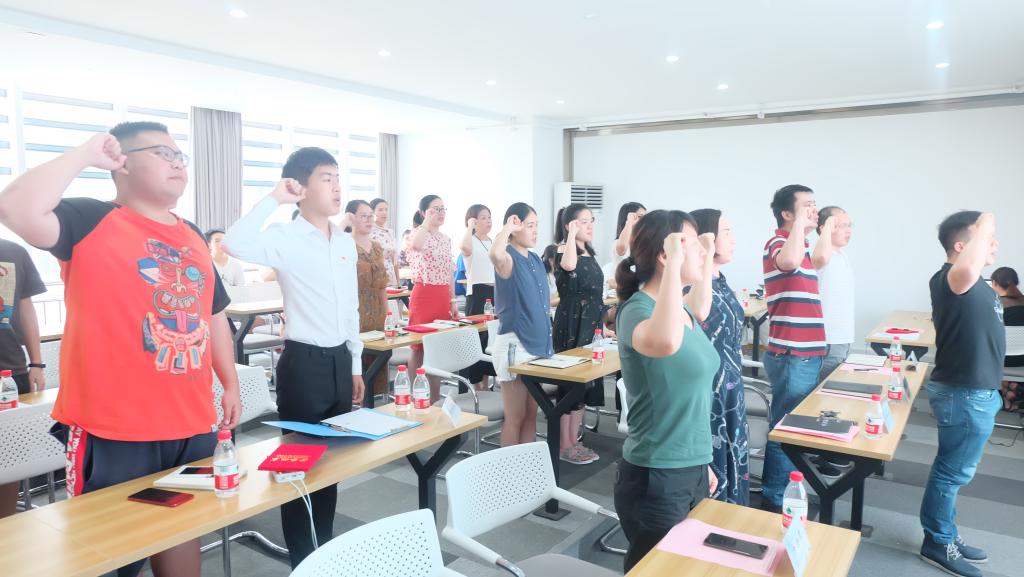 全体师生党员在“优秀党员”荣誉获得者王荟惠的带领下重温入党誓词并观看我校先进党员专题宣传片《坚守》。