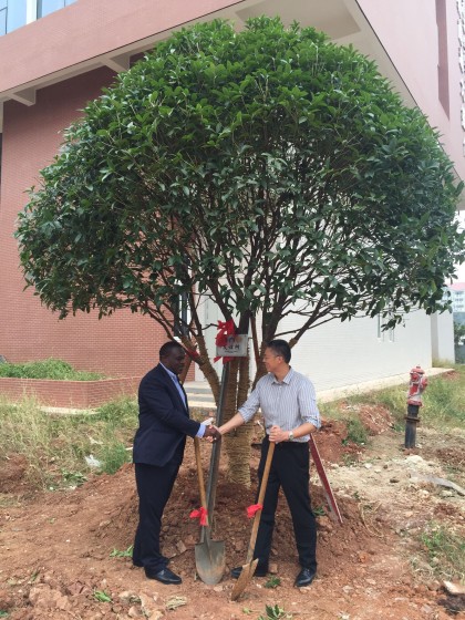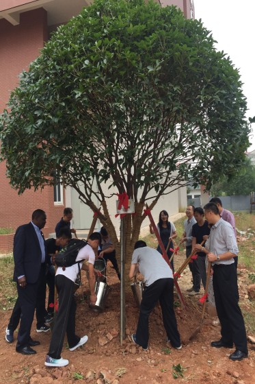 植树现场,副校长蒋昌波、Joseph Owino及师生代表共同为树苗挥锹培土、提桶浇水。大家坚信,在两校的共同呵护下,象征友谊的桂花树一定会根深叶茂、茁壮成长。