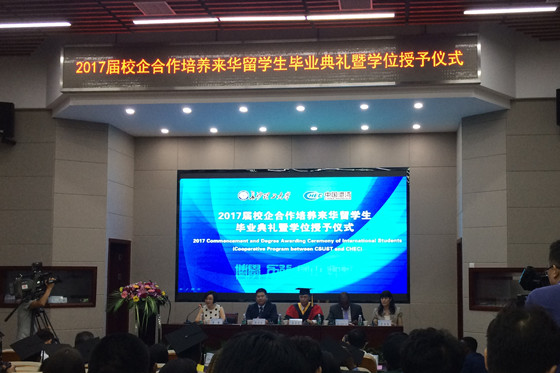 6月29日上午,我校2017届校企合作培养安哥拉、斯里兰卡来华留学生毕业典礼暨学位授予仪式在云塘校区工科二号楼B-301隆重举行。安哥拉洛比托港务局局长DIUR ANGELO KASSUL,湖南省人民政府外事侨务办公室郭向丽处长,留学生的资助方代表,中国港湾工程有限责任公司党委常委、总会计师熊升全,副总经济师、党委组织部部长、人力资源部总经理关巍;党群工作部(企业文化部)副部长贺柏森;党委组织部副部长、人力资源部副总经理孙海军;斯里兰卡区域公司党委副书记、人力资源部经理安昕;南部非洲区域公司市场部副经理杨岑,我校副校长蒋昌波教授出席典礼。我校有关职能部门、学院领导、在校留学生和部分师生代表、留学生亲友近200人参加典礼。