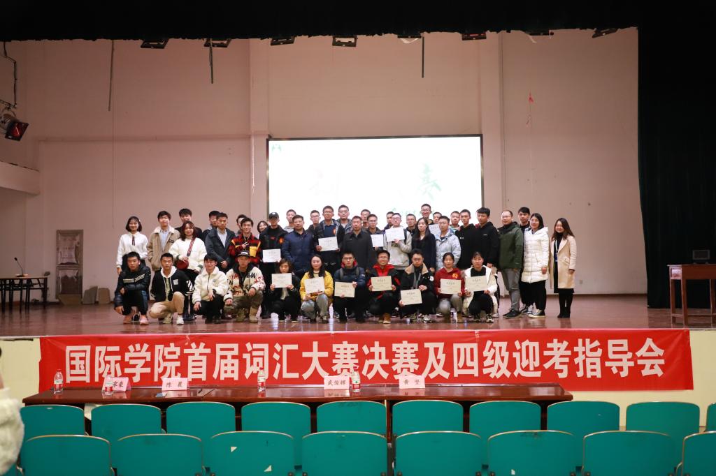为激发学生英语学习兴趣,营造大学生英语四级(CET-4级)备考氛围,12月2日晚,国际学院教务办和学工办在大学生创新创业园科技报告厅联合举办了首届大学生英语单词竞赛暨四级迎考指导会。外国语学院副院长黄坚、武俊辉,新东方前途出国市场部经理陈晨担任大赛评委。国际学院副院长秦卫星、新东方校级演讲师李家豪、党政办主任黄文卫、教务办全体老师和2019级学生辅导员出席本次活动。“柒夜小队”从七组入选决赛选手中脱颖而出,以团体总分第一名的成绩夺得特等奖。