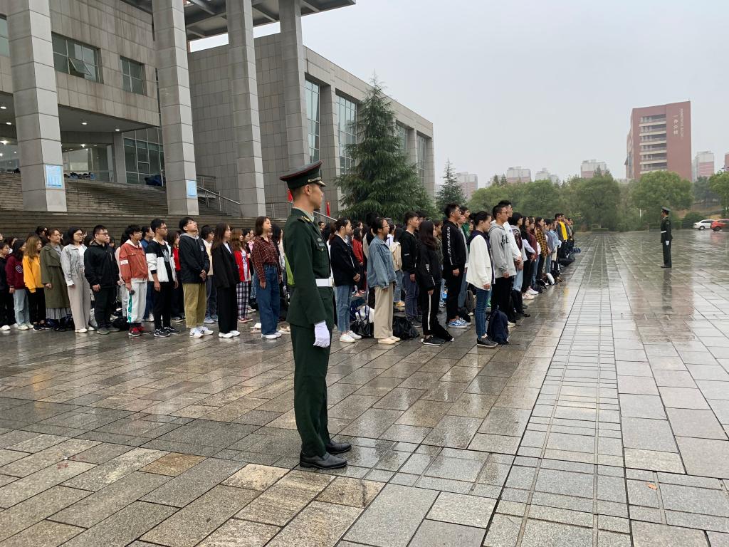 观礼活动当天,虽然下着淅沥小雨,但同学们满怀激情,整齐有序地列队在升旗台前。随着主持人一声令下,国旗班护卫队迈着矫健有力的步伐护送国旗而来。在同学们雄浑嘹亮的国歌声中,鲜艳的五星红旗冉冉升起,在场师生面向国旗庄严肃立,行注目礼,心中漾起崇高的爱国之情。