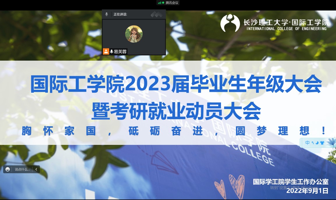 9月1日,国际工学院在腾讯会议平台召开了2023届毕业生年级大会暨考研就业动员会,毕业年级辅导员马玉文、易芙蓉,2023届全体毕业生参会。