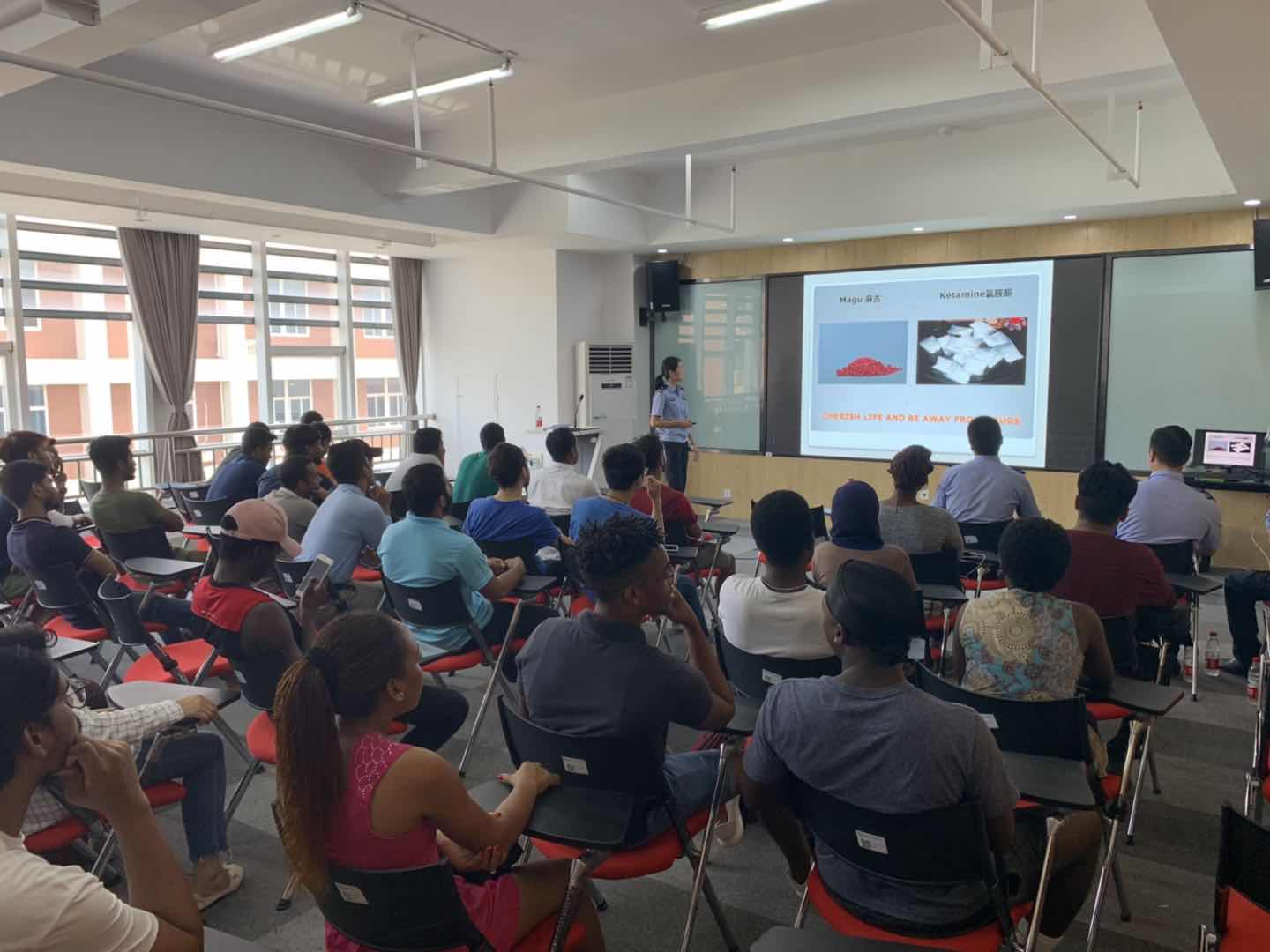 为纪念“6·26国际禁毒日”,配合“国际禁毒日”宣传教育工作,2019年6月27日下午,国际学院举行了来华留学生毒品预防教育暨出入境法律法规专题讲座。