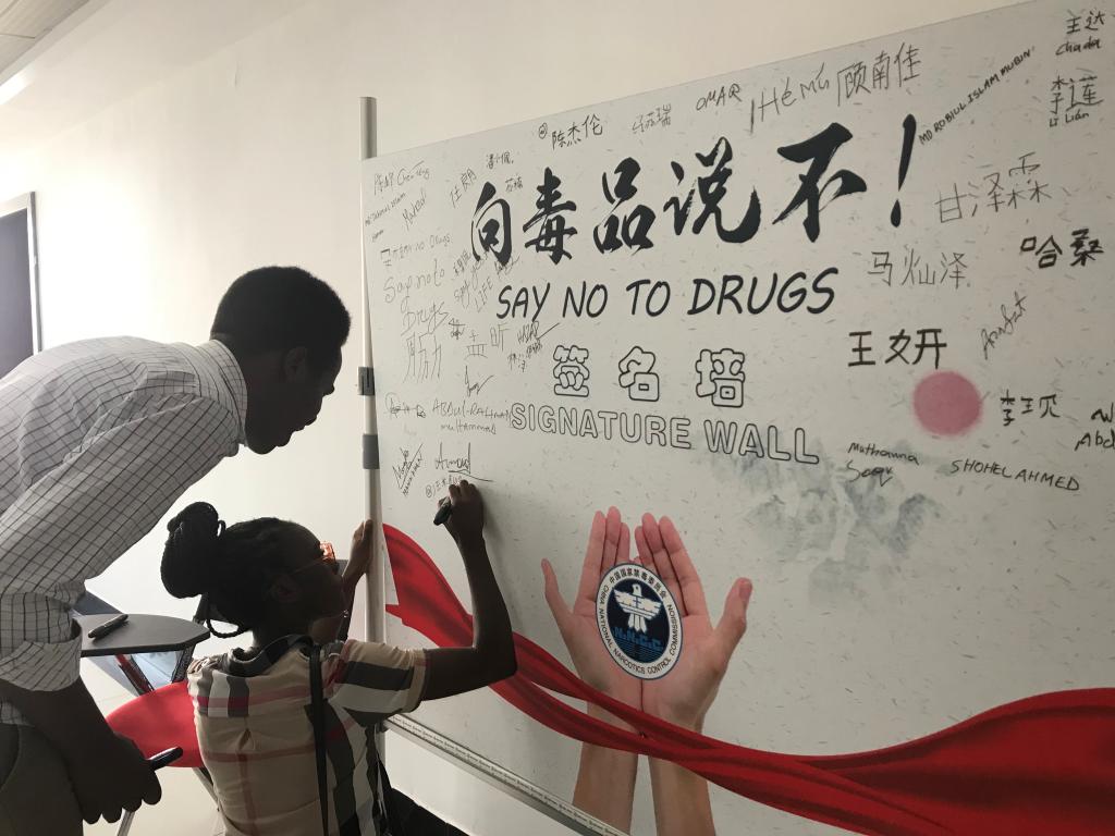 讲座结束后,同学们纷纷在签名墙上签名,作出禁毒承诺:在华学习期间将严格遵守中国的法律法规,自觉抵制毒品,坚决对毒品说不。