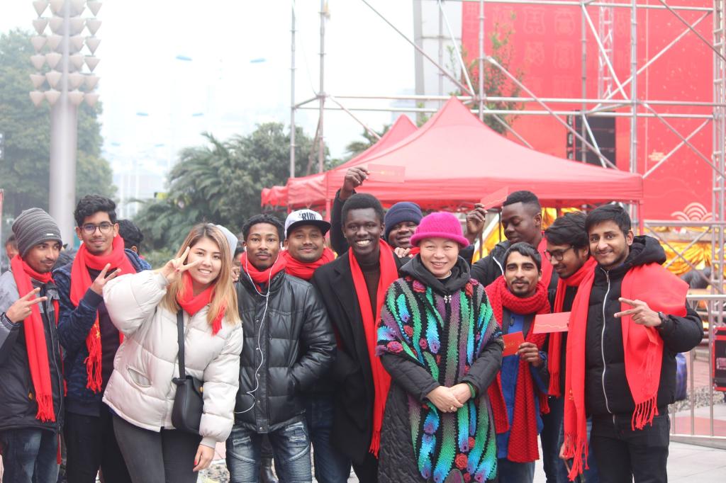 上午,同学们前往步行街中心广场,参加活动开幕式。分别来自多哥、哈萨克斯坦、埃塞俄比亚、孟加拉的安妮、阿依达、高丽、阿哈德和诺扬五位同学,代表太阳成集团tyc122cc入口的留学生们,用自己国家的语言为大家送上新春祝福。留学生独特的拜年方式和流利的汉语,引得台下观众连连喝彩。