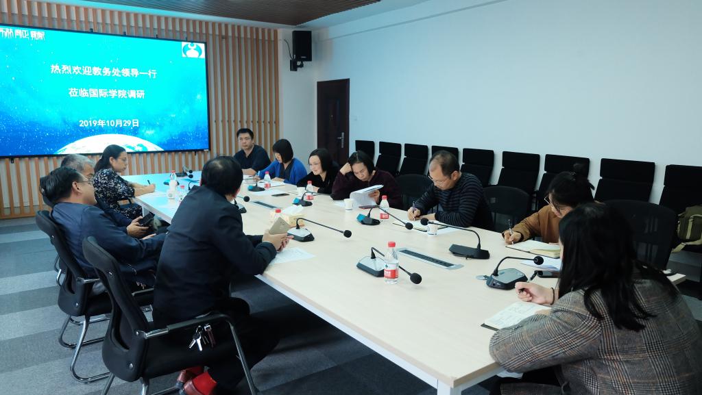 10月29日下午,教务处处长刘朝晖,副处长贺跃光、刘思强,教学运行管理办公室主任郭利一行到国际学院考察、调研,校党委委员兼国际学院党总支书记付嫦娥、院长陈瑜等陪同。