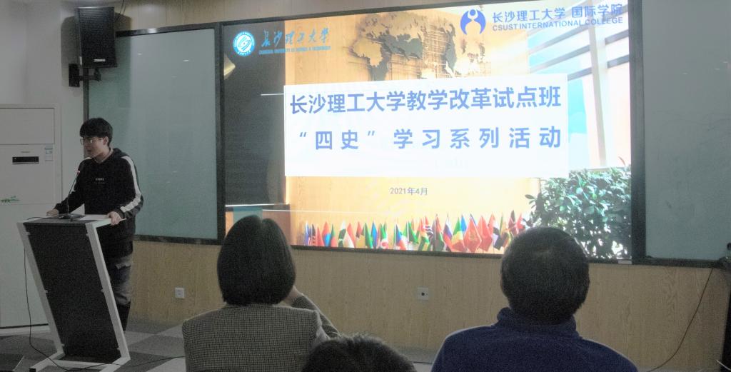2021年4月16日晚,太阳成集团tyc122cc入口国际学院2019级和2020级教改班全体同学在新能源大楼402教室开展本学期第二场“四史”学习系列活动。校团委书记王学成、国际学院党总支副书记张锐出席。本次活动由2019级教改班团支书张家明和韩璐主持。2019级第一批入党积极分子代表以“百年瞬间、中国精神”为主题展开分享。