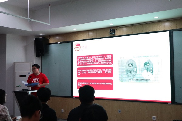 首先,谭哲午带领团员们学习习近平总书记在中国人民大学的讲话精神。他号召同学们共同践行“不负韶华,不负时代,不负人民,在青春赛道上奋力奔跑,争取跑出当代青年的最好成绩。”随后,杨富坤、李家鑫、向科全、龙华强、余福源等7名团员代表从共青团的成立、团旗团徽团歌的规范使用、共青团的章程、早期团员黄爱的故事、张太雷与共青团的故事等角度向大家介绍建团百年来的峥嵘历史,分享自己的思考,团员们的宣讲情绪饱满,他们表达了对悲壮历史的缅怀令人动容,对前辈英雄的敬意,及为祖国建设添砖加瓦的决心与担当催人奋进。