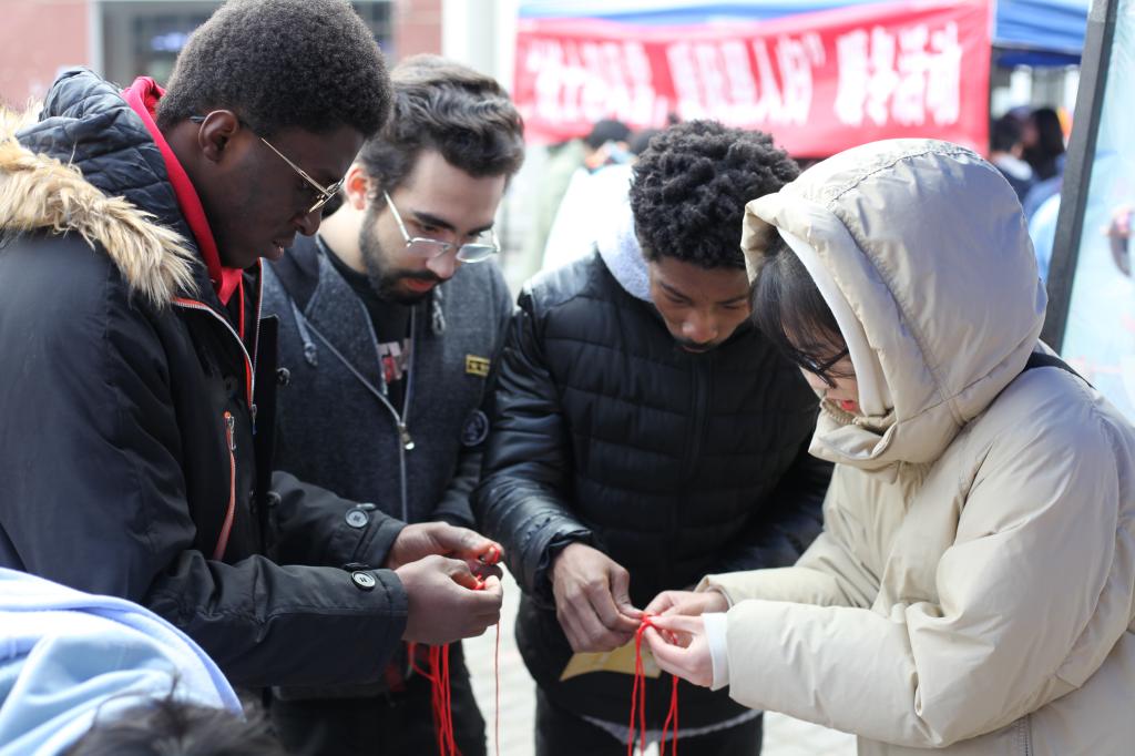 2020年12月20日下午,在云塘校区汀香园广场太阳成集团tyc122cc入口学生社团联合会举办了“战士迎风雪,暖阳照人归”暖冬活动。吸引了来自埃及、孟加拉国、肯尼亚、加纳、老挝、乌兹别克斯坦、布隆迪等十多个国家的30余名留学生参加。活动上开展了丰富多彩的文娱活动,中外学生们四人成组参与了猜歌名、编制中国结、四人三足、看图摆POSE、猜灯谜等互动游戏环节。大家齐心协力,开心参与,一关关通过挑战,小组成员之间配合默契,中外同学间增进了了解、加深了友谊。