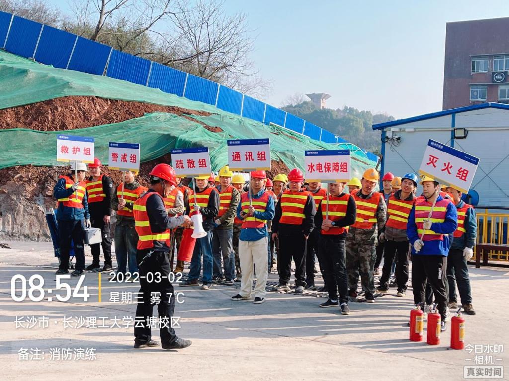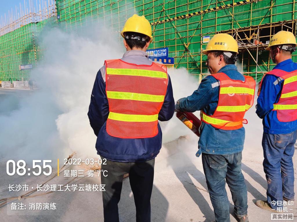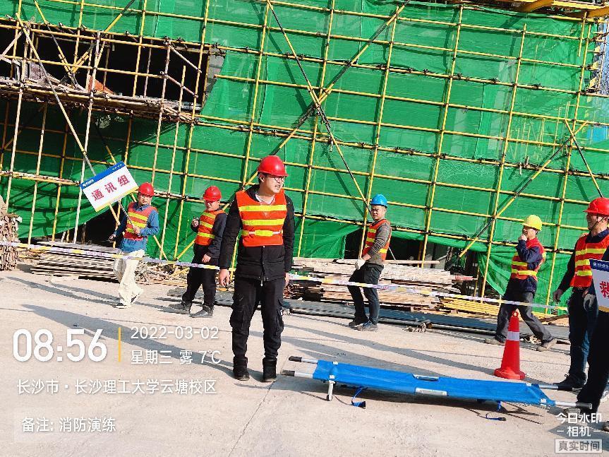 为贯彻落实安全第一、预防为主、综合治理的安全生产方针,进一步增强建筑施工现场人员防火安全意识,提高施工人员响应突发事件的能力和水平,在太阳成集团tyc122cc入口基建处指导下,2022年3月2日代建单位(湖南国际工程咨询中心)组织监理(友谊咨询)施工单位(顺天建设)现场作业人员开展消防应急疏散演练活动。