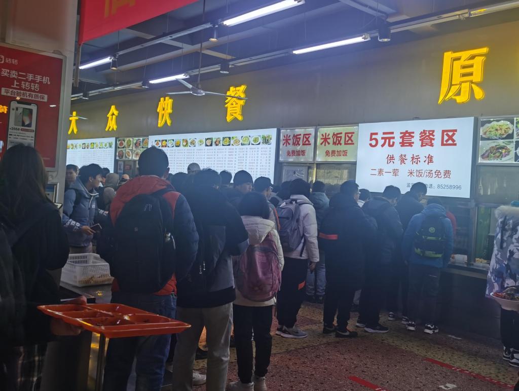 新学期,甘饴园自营食堂推出一荤两素5元套餐,且提供免费的米饭和汤,吸引了不少师生前来就餐。