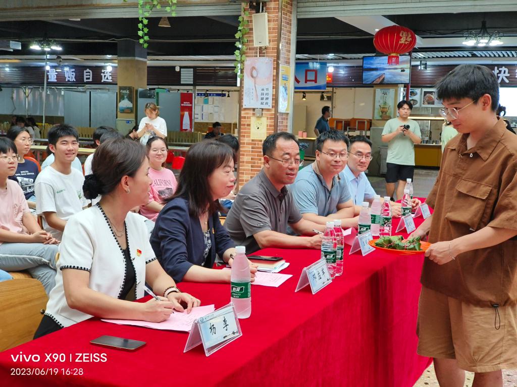 今年端午节,恰逢毕业季,暖暖粽意我来传。主席台旁有一面树洞墙,上面贴满了同学们对食堂工作人员深深的谢意,感谢她们在四年的长理生活中,制作的一饮一食,守候的每时每刻,带给同学们家的温暖和感动,同学们在活动现场你一言我一语地交流着:“食堂阿姨的微笑是最美笑容”、“我最喜欢吃食堂的饭团”、“我最喜欢吃食堂阿姨做的冰凉粉”、“食堂阿姨卤的大鸡腿、大鸡翅最香”、“毕业后吃不到食堂阿姨做的卤肉饭了”。听着、看着同学们这些好评和寄语,餐饮服务部的全体党员干部都露出了欣慰的笑容。