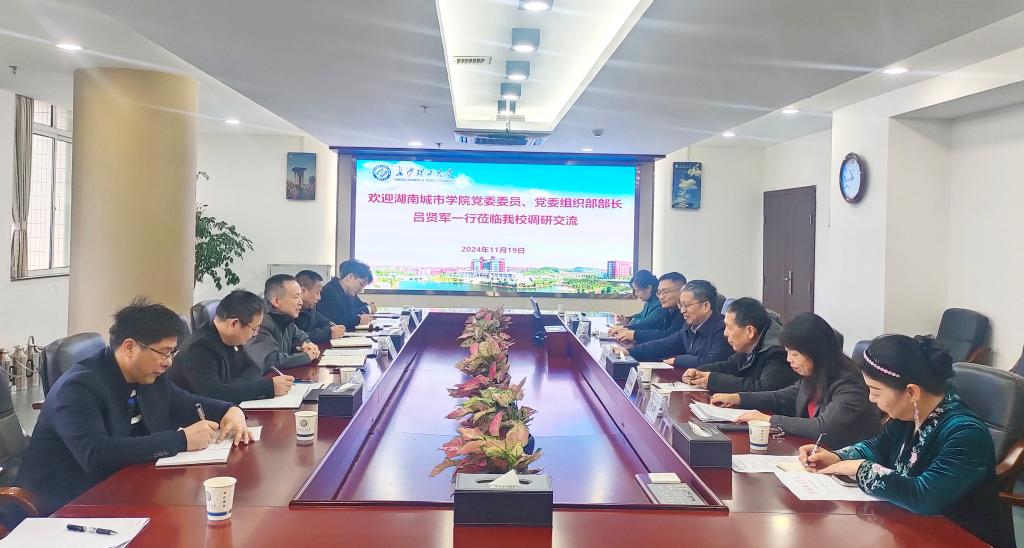 1119上午湖南城市学院党委委员、党委组织部部长吕贤军一行来我校调研交流校党委委员、副校长胡永乐,后勤中心党委书记王学成主任孔蔚湘、副主任邓应军相关部门负责人参加座谈交流