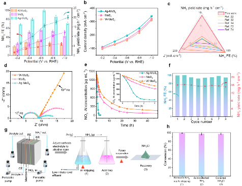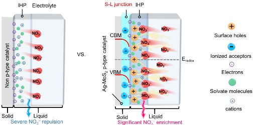 有鉴于此,我院廖婉茹博士、王君博士与中南大学刘敏教授、中国环境科学研究院席北斗研究员、德国慕尼黑大学Emiliano Cortés教授合作,开发了具有普适性的催化剂能带结构调控策略,利用Ag掺杂MoS2(Ag-MoS2)在NO3?还原体系中构筑固液结,诱导空穴从催化剂向电极/电解质界面转移,促进IHP区域内分布正电荷,实现工况条件下NO3?有效富集(NO3?浓度提高了约15.8倍)。利用这种富集效应,Ag-MoS2在超低NO3?浓度(≤10 mM)下实现了接近100%的NH3法拉第效率。此外,该催化剂以接近100%的效率将NO3?转化为高附加值的NH4Cl产品,展示了通过环境友好路线实现工业化规模生产的潜力。