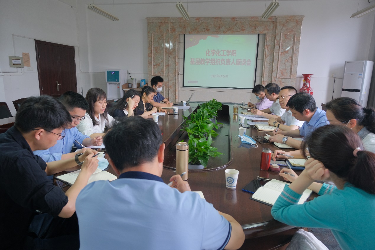 为深入贯彻落实习近平新时代中国特色社会主义思想、党的十九大和十九届历次会议精神,全面深化教育教学改革,大力加强学院基层教学组织建设,促进学院基层教学组织之间的交流,全面提升学院人才培养质量。化学化工学院于4月26日在工科三号楼B318会议室召开了基层教学组织负责人座谈会。会议由学院副院长陈启杰主持,学院党委书记宋刘斌,副院长张跃飞,教学督导组组长,全体基层教学组织负责人参加会议。