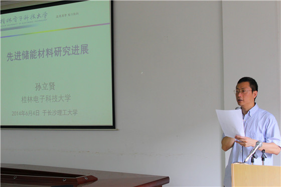 6月2-4日,我国著名的储氢储能和材料物理化学研究专家、我校“湖湘学者”特聘教授、中科院优秀“百人计划”学者、广西“八桂学者”、桂林电子科技大学材料科学与工程学院院长、博士生导师孙立贤教授来到化学与生物工程学院指导研究和交流讲学。两天来,孙教授与化学学院能源材料与分析监测科研团队的骨干成员进行了广泛的研讨,并就新能源材料和材料监测新技术等领域的研究前沿及发展趋势与各位老师和研究生进行了面对面的交流,提出了新能源材料下一步发展的目标和实施的方向。
